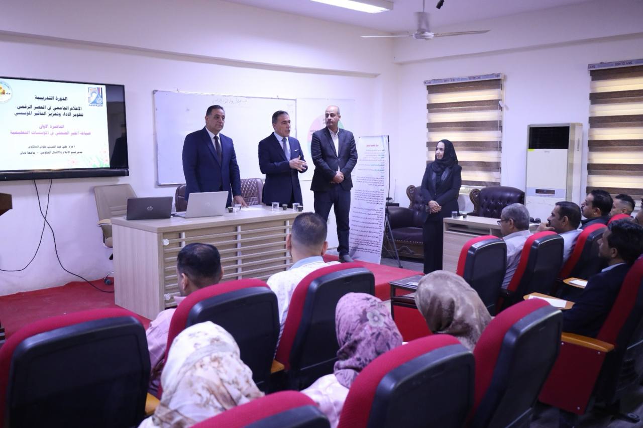 رئيس جامعة ديالى يؤكد دعم تطوير الإعلام الجامعي خلال حضوره دورة في مركز التعليم المستمر … أكد السيد رئيس جامعة ديالى الأستاذ الدكتور (تحسين حسين مبارك) المحترم، أهمية تطوير الإعلام الجامعي ومواكبة التحول الرقمي، وذلك خلال حضوره الدورة التدريبية التي أقامها مركز التعليم المستمر ، بإشراف الأستاذ المساعد الدكتورة (بيداء حسن حسين) المحترمة مديرة مركز التعليم المستمر نظم المركز دورة بعنوان: (الإعلام الجامعي في العصر الرقمي: تطوير الأداء وتعزيز التأثير المؤسسي) وذلك اليوم الاثنين الموافق ٢٠٢٦/٤/١٣، لمنتسبي قسم الإعلام والاتصال الحكومي في الجامعة و الكليات وحاضر في الدورة السيد مدير قسم الإعلام و الاتصال الحكومي الأستاذ المساعد الدكتور (علي عبد الحسين علوان) المحترم ، حيث تناول خلالها أهمية الإعلام الجامعي في ظل التحول الرقمي، ودوره في تعزيز الصورة المؤسسية، فضلاً عن استعراض أحدث الأساليب والتقنيات في صناعة المحتوى الإعلامي. كما تطرّق إلى سبل تطوير الأداء الإعلامي من خلال توظيف المنصات الرقمية ووسائل التواصل الاجتماعي، بما يسهم في رفع مستوى التأثير المؤسسي وتحقيق التواصل الفعّال مع الجمهور.